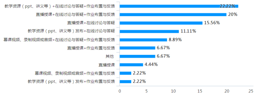 教师结合课程特点,利用多种网络平台开展在线教学,如天体MOOC、天体资源云、教学微信群/QQ群、超星学习通、腾讯课堂、腾讯会议、ZOOM等。教师授课方式表现为多元化,包括直播授课、慕课视频或录制视频音频、教学资源(PPT、讲义等)发布,同时辅以在线讨论与答疑和作业布置与反馈等。88.89%的教师采用多种教学方式结合的方案进行在线教学,其中直播授课占42.23%,为保障教学效果,86.67%的教师提前向学生发布教学所需的资料,77.78%的教师组织了在线讨论与答疑。为了及时掌握学生的学习情况,84.44%的教师每周至少进行1次随堂提问或测验,91.11%的教师每周至少布置1次作业,95.56%的教师每周至少进行1次线上答疑(或发起线上讨论)。