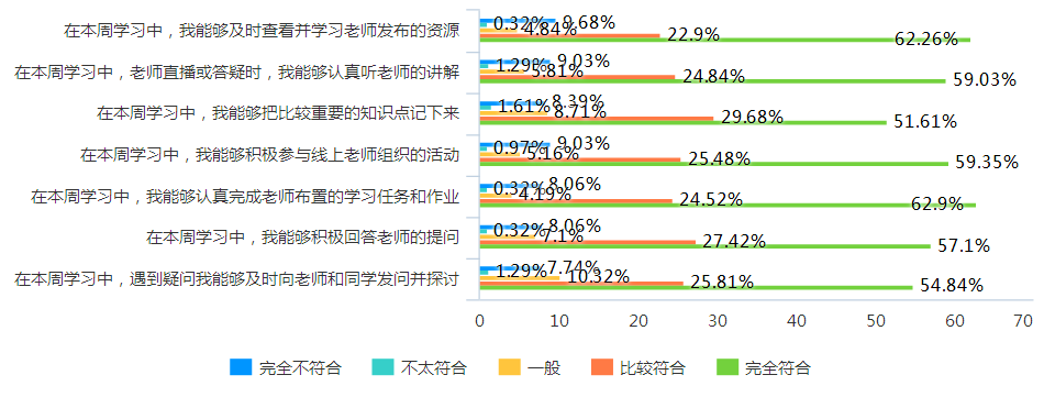 1.在学习总体表现方面,八成以上的学生能够及时查看并学习老师发布的资源,教师直播或答疑时能够认真听老师讲解,能够把重要的知识点记下来,积极参与老师组织在线讨论活动,认真完成老师布置的学习任务和作业。