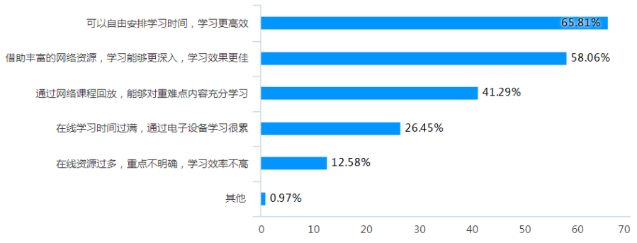 3.在学习感受方面,在线学习具有其独特的优势,为学生提供了便利条件,部分学生能达到较好的学习状态,体现为能够自由安排时间,学习更高效(65.81%);借助丰富资源,学习能够更深入,学习效果更佳(58.06%);能通过网络课程回放,对重难点充分学习(41.29%)。同时,我们也关注到部分学生的学习体验受到影响,体现为感觉在线学习时间安排较满,通过电子设备学习较累(26.45%);在线学习资源过多,重点不明确(12.58%)。这些问题提示教学模式的转变给学生带来一定的冲击,教师和各学院应进一步加强对学生的指导和关注。
